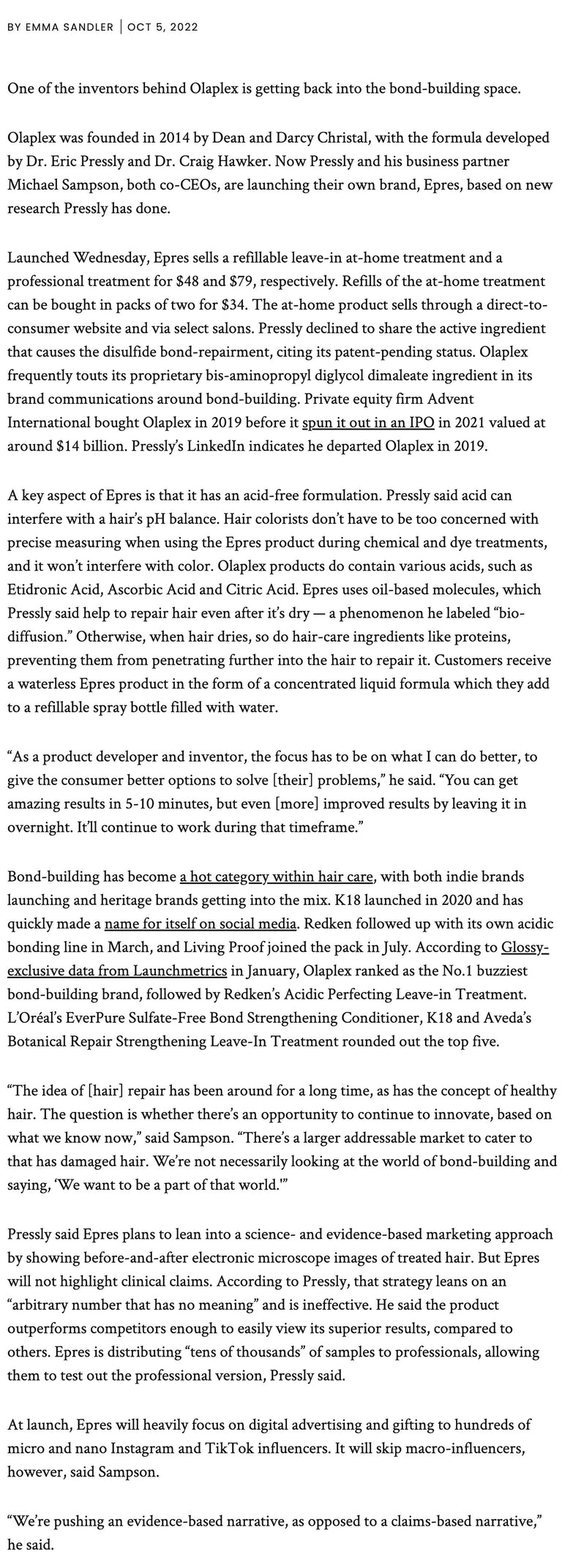 "Olaplex inventor is back with Epres, another bond-building brand" by Emma Sandler